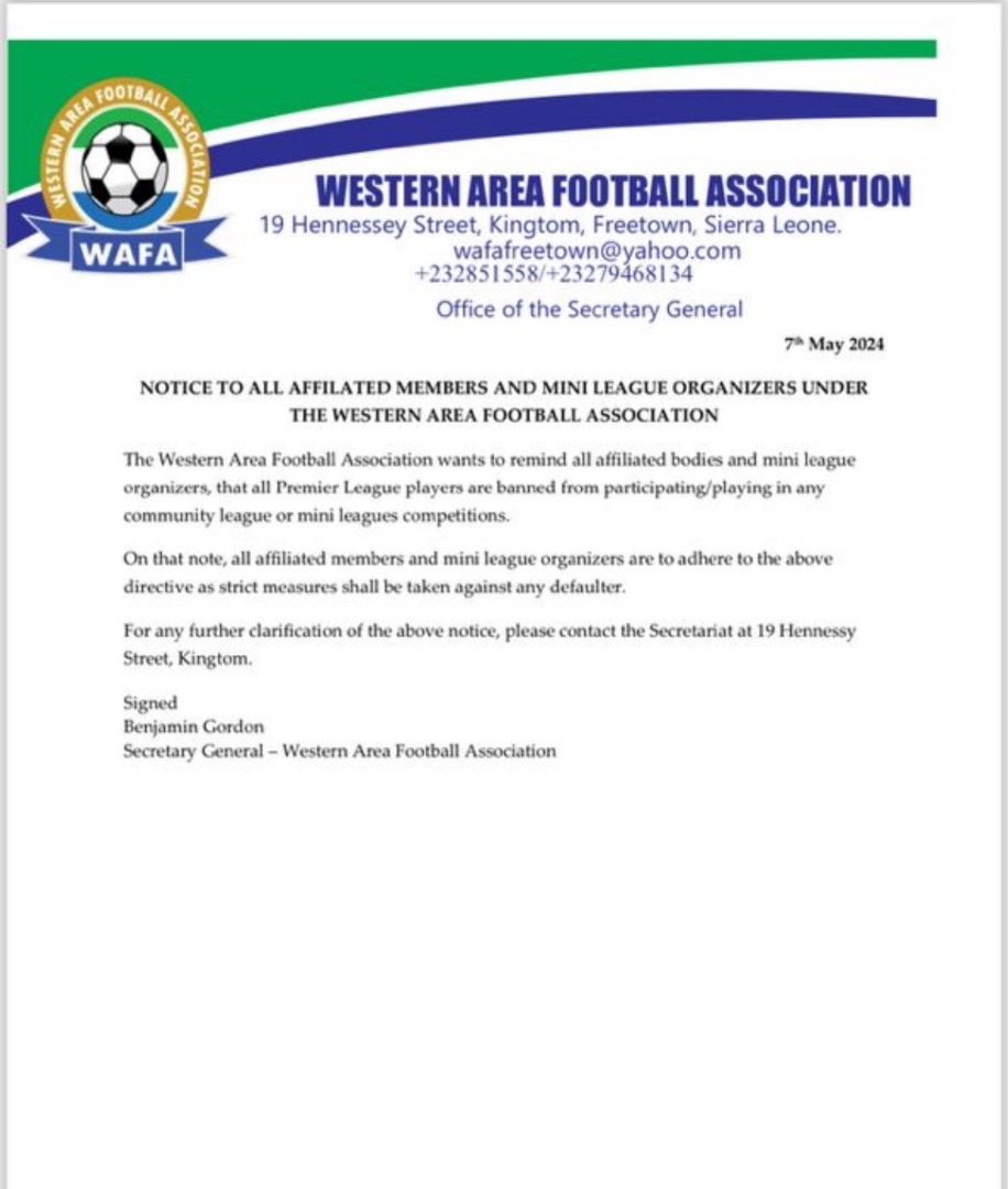 The West Area Football Association (WAFA) has in a press release issued a ban on all active Sierra Leone Premier League players from participating in any community or mini-league competition.