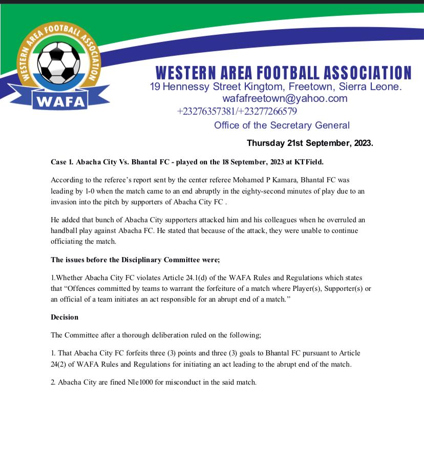 The Western Area Football Association (WAFA) Disciplinary Committee has ruled against Abacha City in their match against Bhantal FC played on 18 September 2023 at KT Field.