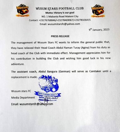 The Management Of Wusum Stars Fc wants to inform the general public that, they have relieved their Head Coach Abdul Rahman Turay (Agina) from his duty as head coach of the Club with immediate effect. Management appreciates him for his contributions in building the Club and wishing him good luck I his new adventure.